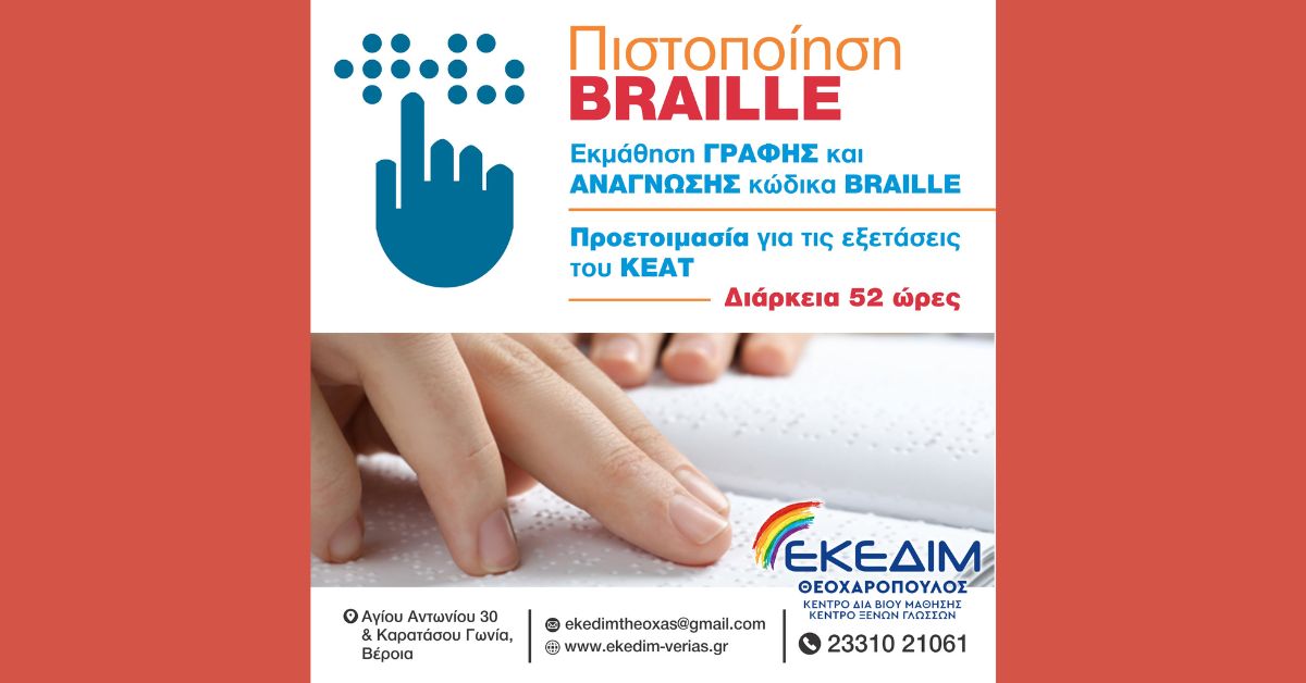 Το Κέντρο Δια Βίου Μάθησης ΕΚΕΔΙΜ ΘΕΟΧΑΡΟΠΟΥΛΟΣ , στα πλαίσια της συνεργασίας με τον Πανελλήνιο Σύνδεσμο Τυφλών, Περιφερειακή Ένωση Κεντρικής Μακεδονίας, υλοποιεί τμήματα εκμάθησης του συστήματος γραφής και ανάγνωσης Braille για τυφλούς, με σκοπό την απόκτηση πιστοποίησης.