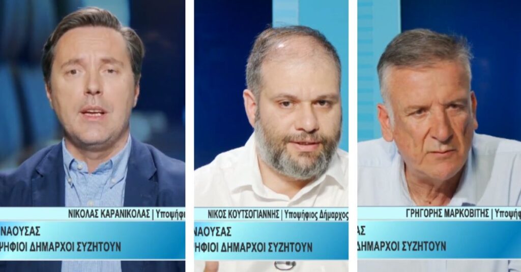 Στο πάνελ της τηλεόρασης TV100 βρέθηκαν οι υποψήφιοι Δήμαρχοι Νάουσας, Νικόλας Καρανικόλας, Νίκος Κουτσογιάννης και Γρηγόρης Μαρκοβίτης.
