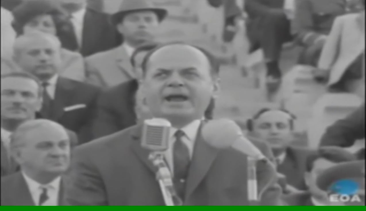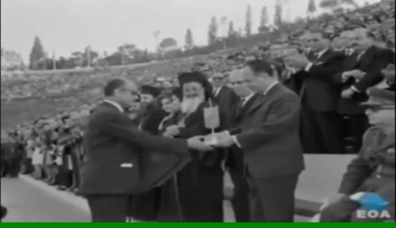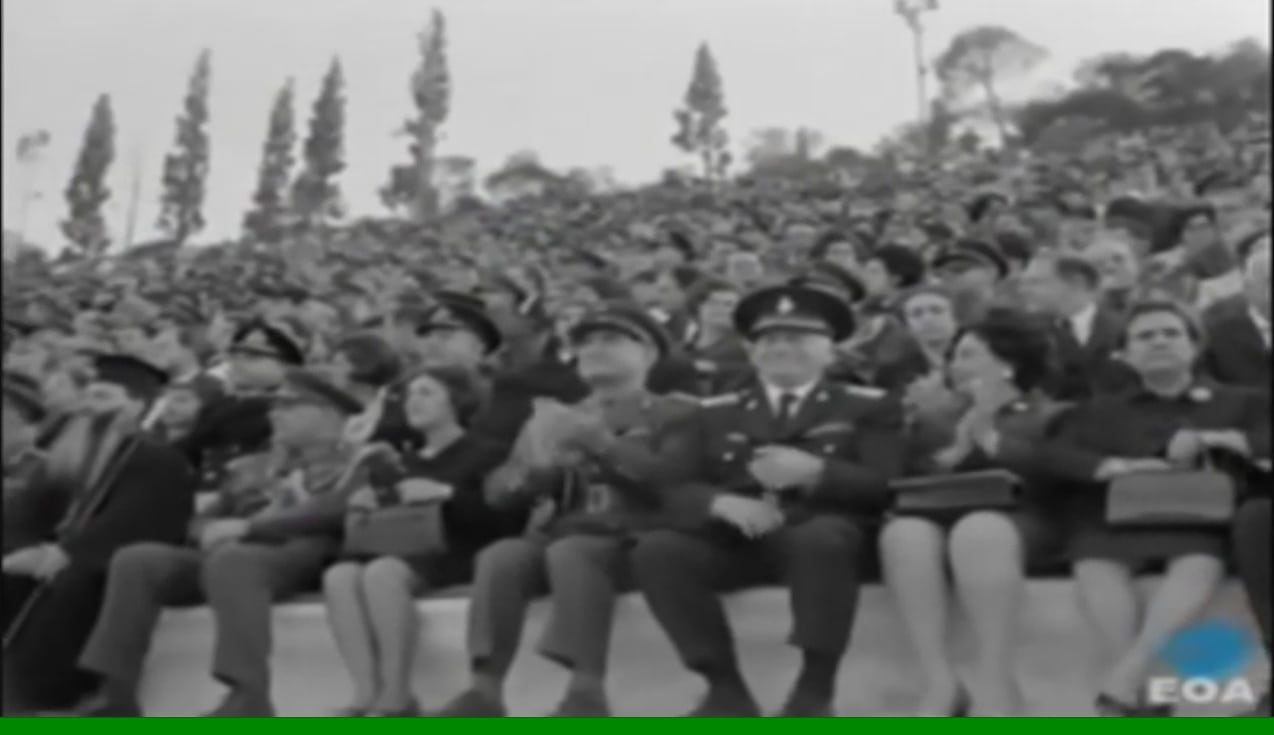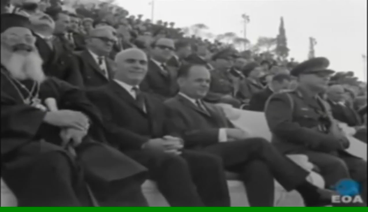 Ο Γ. Παπαδόπουλος εκφωνεί λόγο ενώ οι παριστάμενοι επίσημοι και ο συγκεντρωμένος κόσμος παρακολουθούν. Οι παριστάμενοι χειροκροτούν. Ανθοστόλιστα άρματα και ομάδες του Στρατού Ξηράς, του Ναυτικού, της Αεροπορίας και των Σωμάτων Ασφαλείας παρελαύνουν ενώ ο Γ. Ζωιτάκης και οι λοιποί παριστάμενοι επίσημοι (ανάμεσα στους οποίους ο Γενικός Γραμματέας του Υπουργείου Δημοσίας Τάξης Ιωάννης Λαδάς και ο Γενικός Γραμματέας του Υπουργείου Προεδρίας Κυβερνήσεως Κωνσταντίνος Παπαδόπουλος) παρακολουθούν.