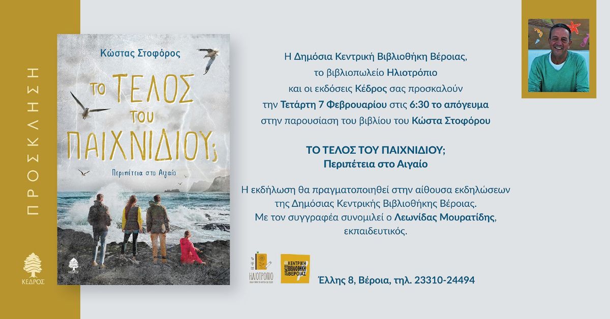 Verianet > News > Ατζέντα > “Το τέλος του παιχνιδιού; Περιπέτεια στο Αιγαίο” – Το νέο βιβλίο του Κώστα Στοφόρου στη Δημόσια Κεντρική Βιβλιοθήκη (7/2/24)