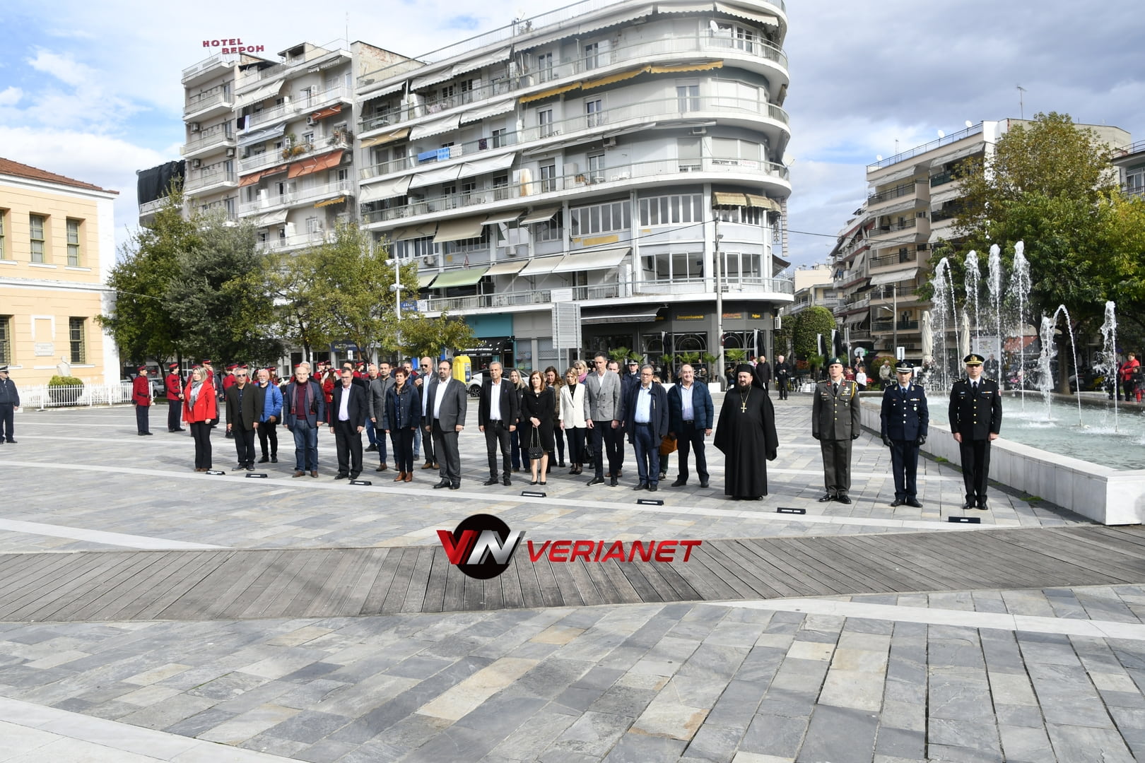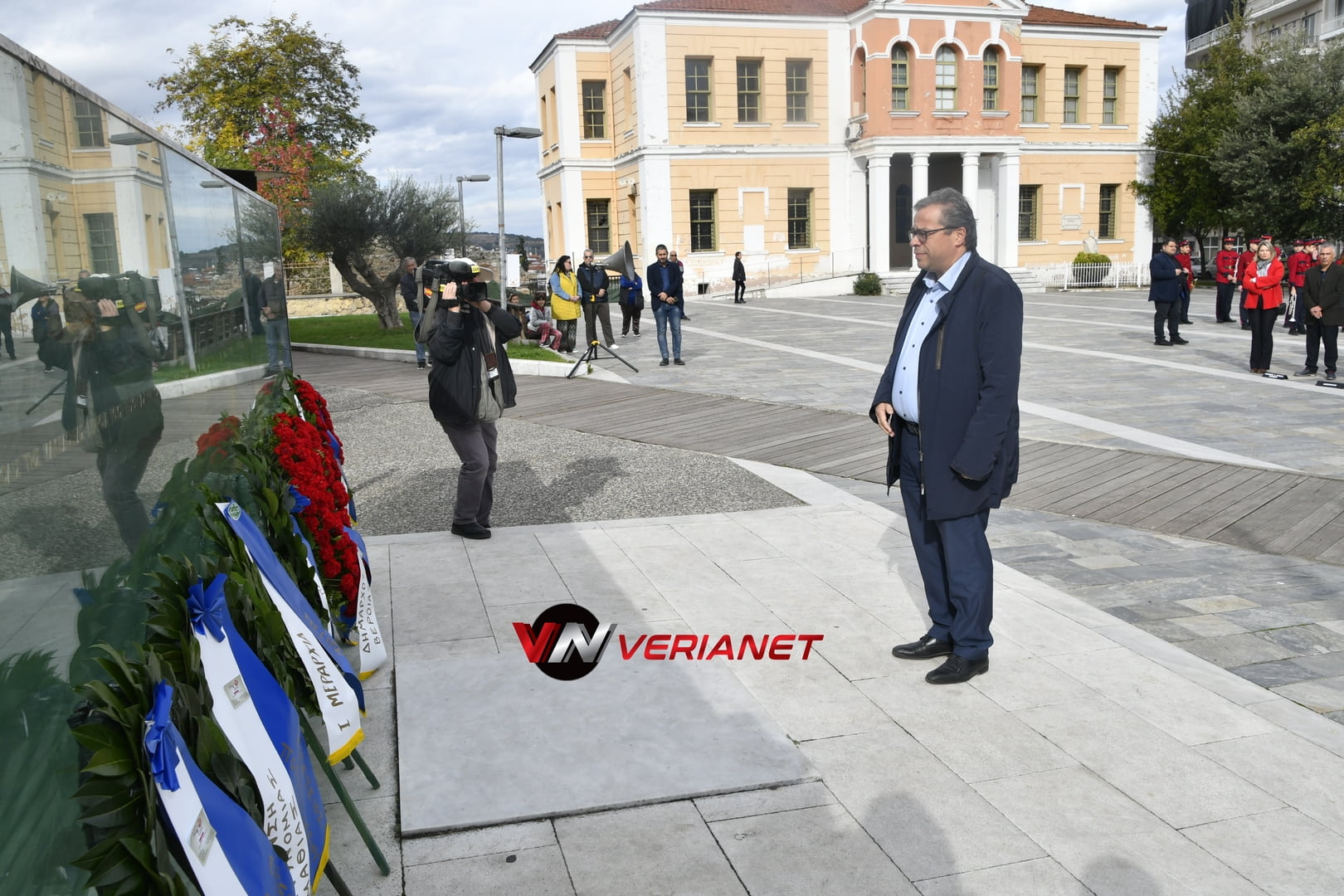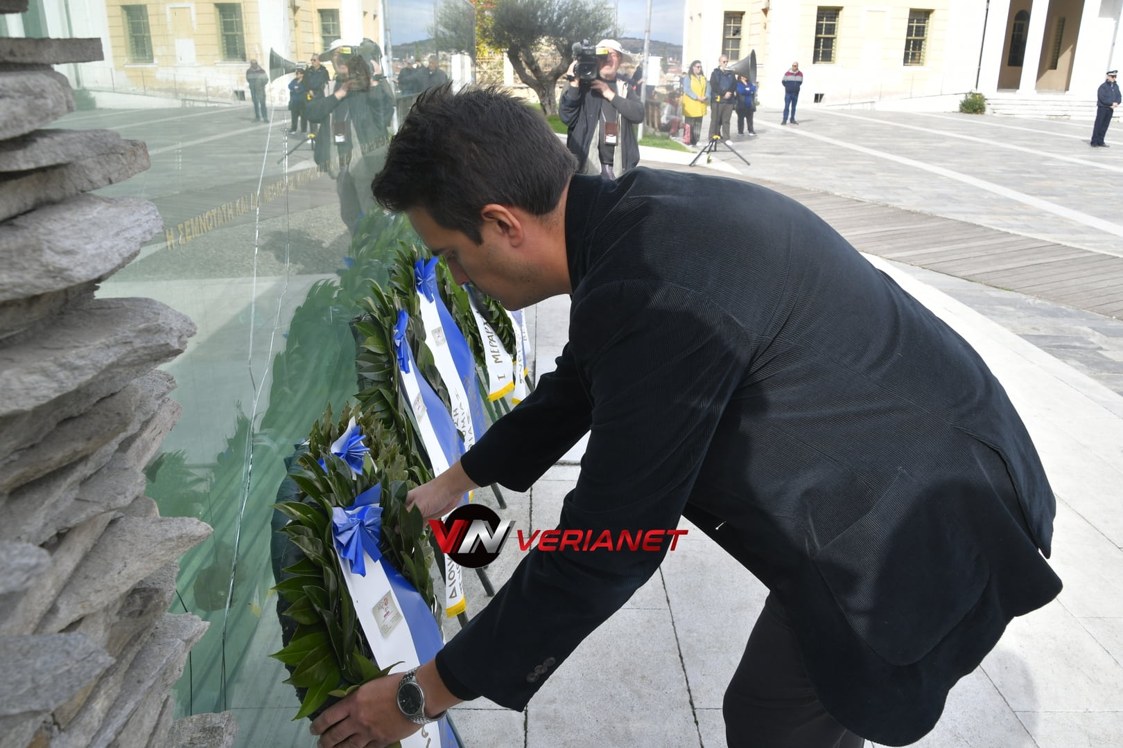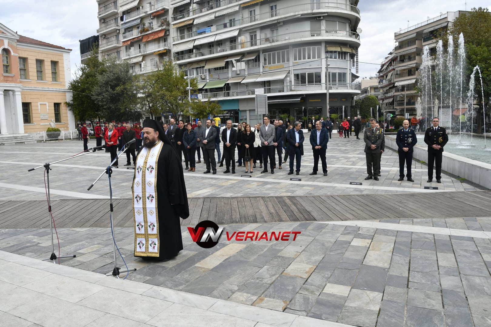 Στις 12 το μεσημέρι έγινε η προσέλευση των επισήμων στον χώρο του Ηρώου της πόλης στην πλατεία Ωρολογίου, όπου ακολούθησε επιμνημόσυνη δέηση από τον Αρχιμ. Σωφρόνιο Φάκα και κατάθεση στεφάνων.