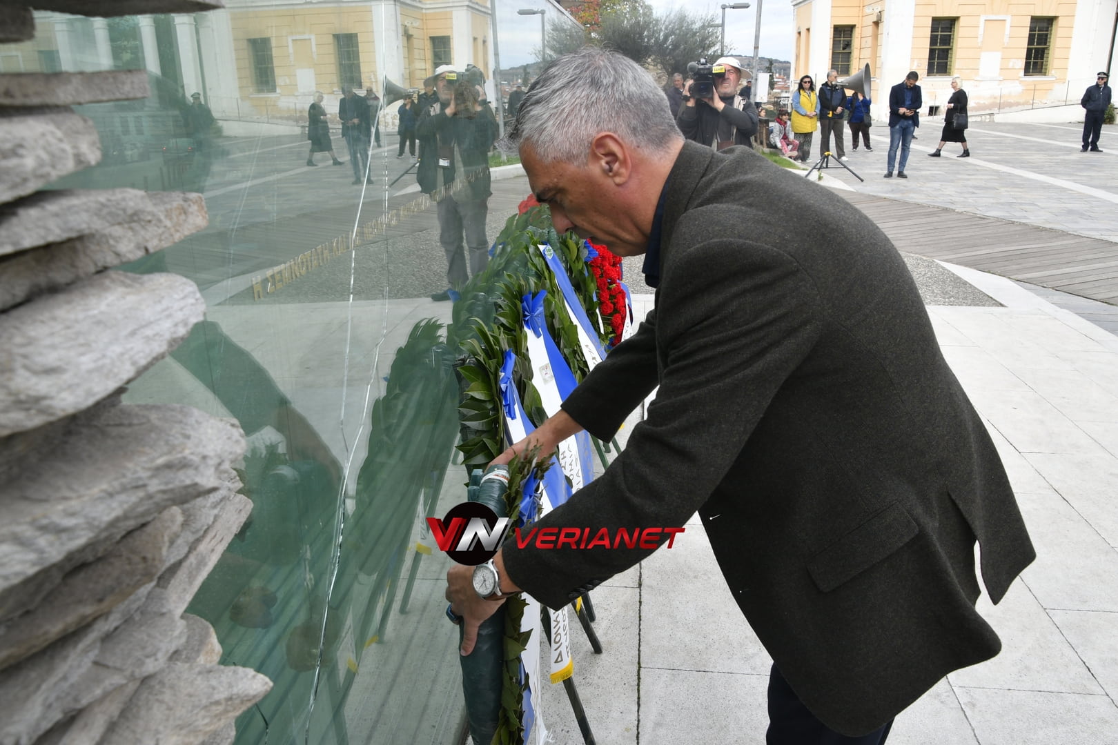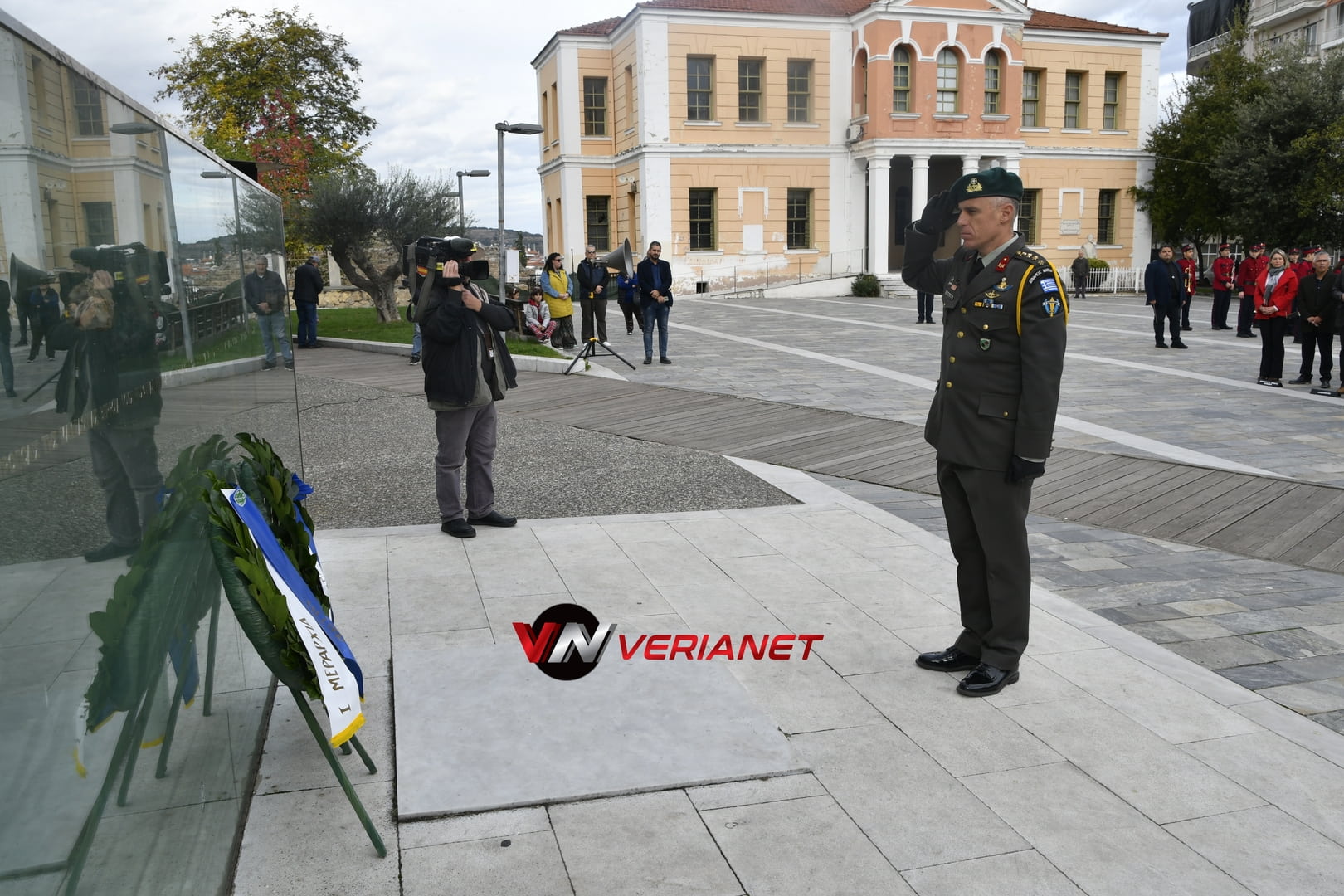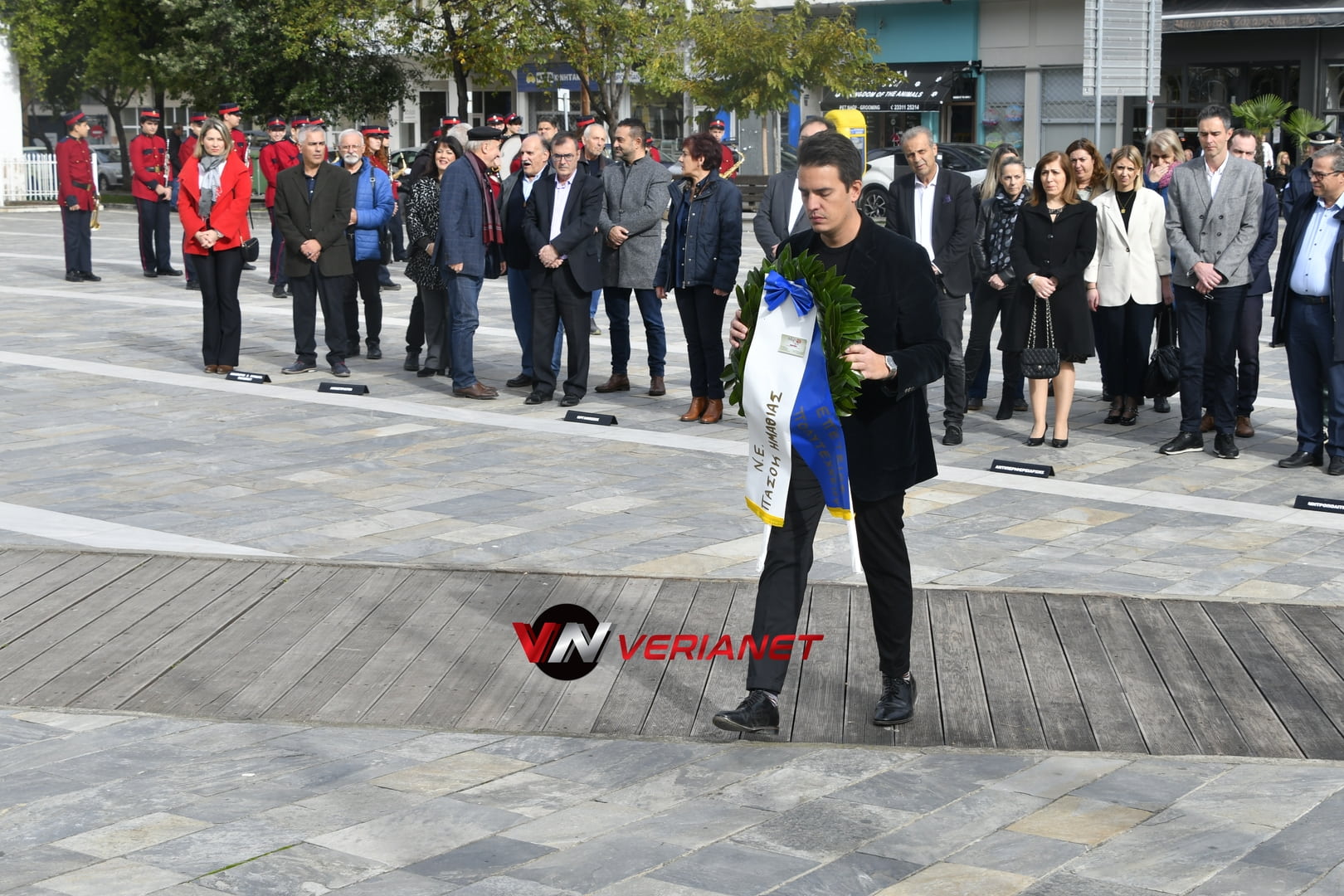 Στις 12 το μεσημέρι έγινε η προσέλευση των επισήμων στον χώρο του Ηρώου της πόλης στην πλατεία Ωρολογίου, όπου ακολούθησε επιμνημόσυνη δέηση από τον Αρχιμ. Σωφρόνιο Φάκα και κατάθεση στεφάνων.