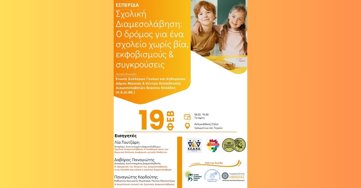 Η Ένωση Συλλόγων Γονέων και Κηδεμόνων Δήμου Βέροιας, σε συνεργασία με το Κέντρο Εκπαίδευσης Διαμεσολαβητών Βορείου Ελλάδος (Κ.Ε.ΔΙ.ΒΕ.), διοργανώνουν εσπερίδα με τίτλο “Σχολική Διαμεσολάβηση: Ο δρόμος για ένα σχολείο χωρίς βία, εκφοβισμούς & συγκρούσεις”.