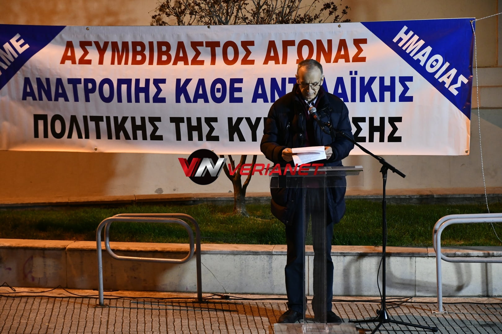 Χαιρετισμό απηύθυνε ο Πρόεδρος της ΑΔΕΔΥ Ημαθίας Θεόδωρος Κακαγιάννης και ακολούθησαν ομιλίες από: την Πρόεδρο του Συλλόγου Εργαζομένων στο ΠΕΔΥ Βέροιας, Λαμπρινή Χουλιάρα, τον Πρόεδρο Εργαζομένων Νοσοκομείου Βέροιας Ηλία Νοβάκη, την Πρόεδρο Εργαζομένων Νοσοκομείου Νάουσας Στέλλα Ζάλιου και τον Πρόεδρο Νοσοκομειακών Ιατρών Γιώργο Καρτσιούνη.