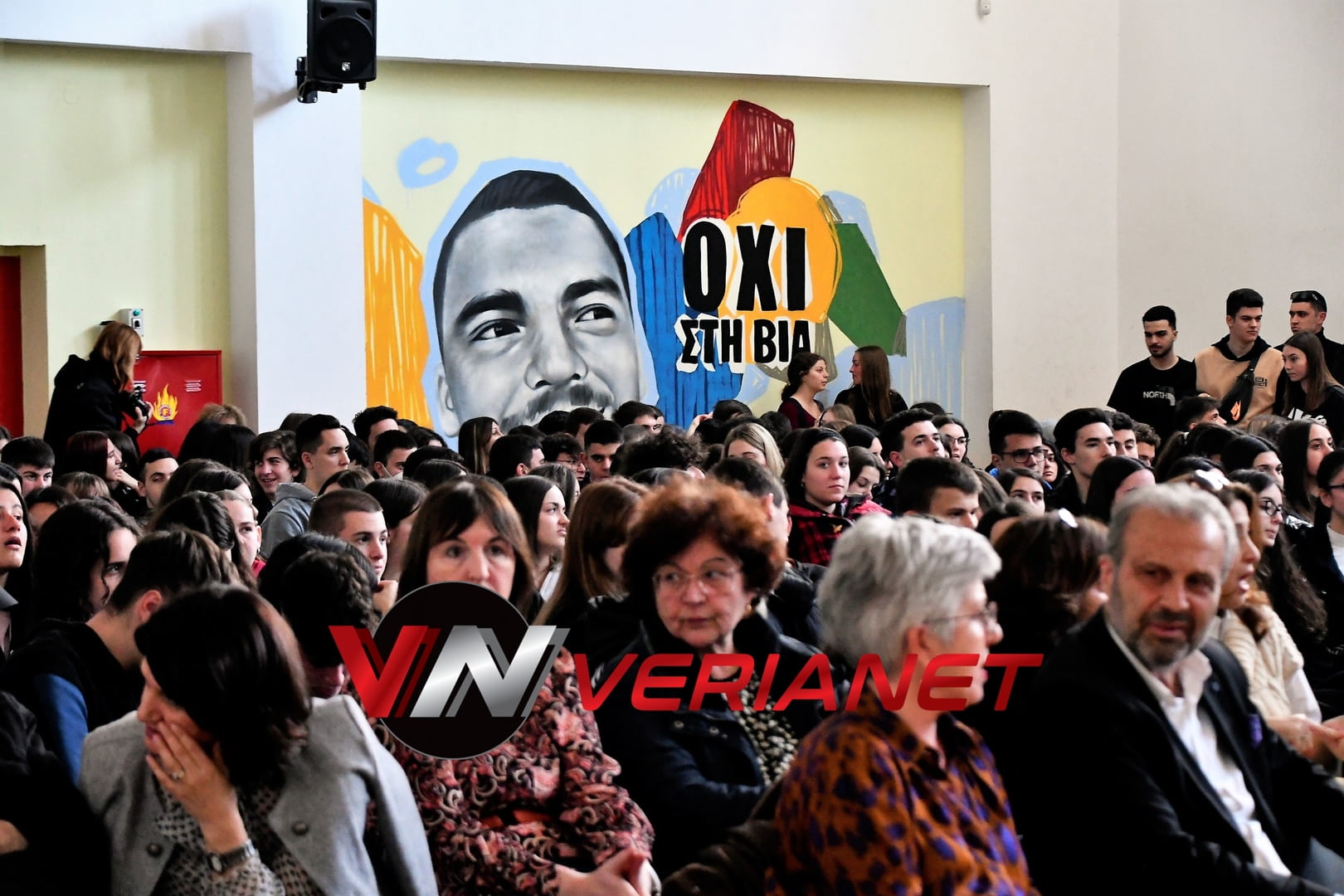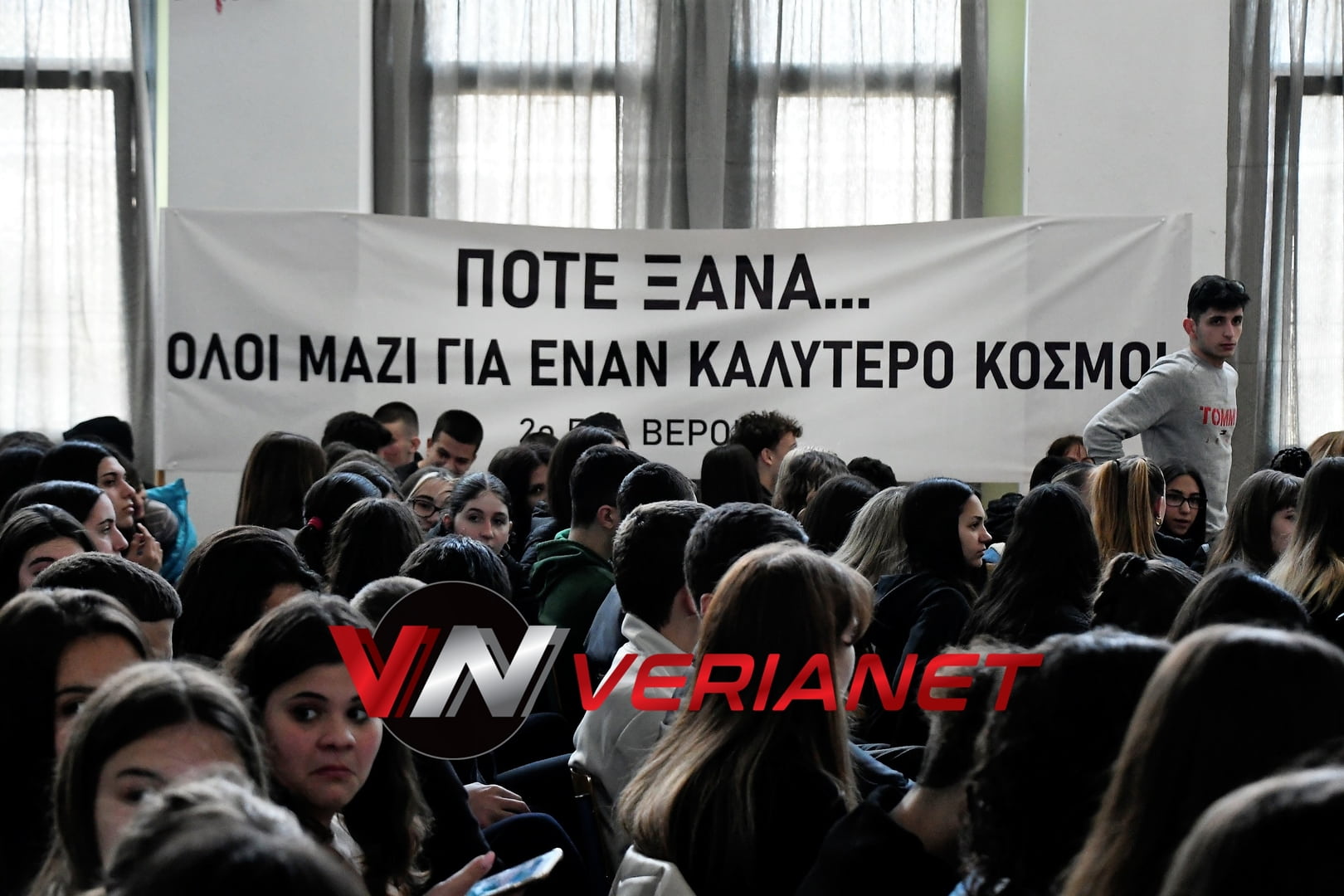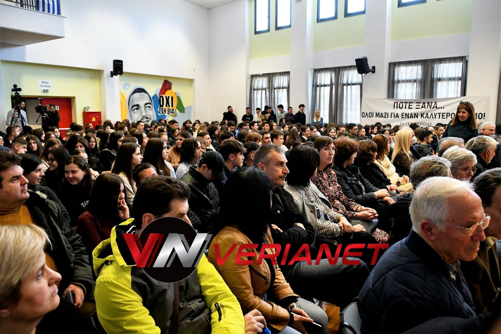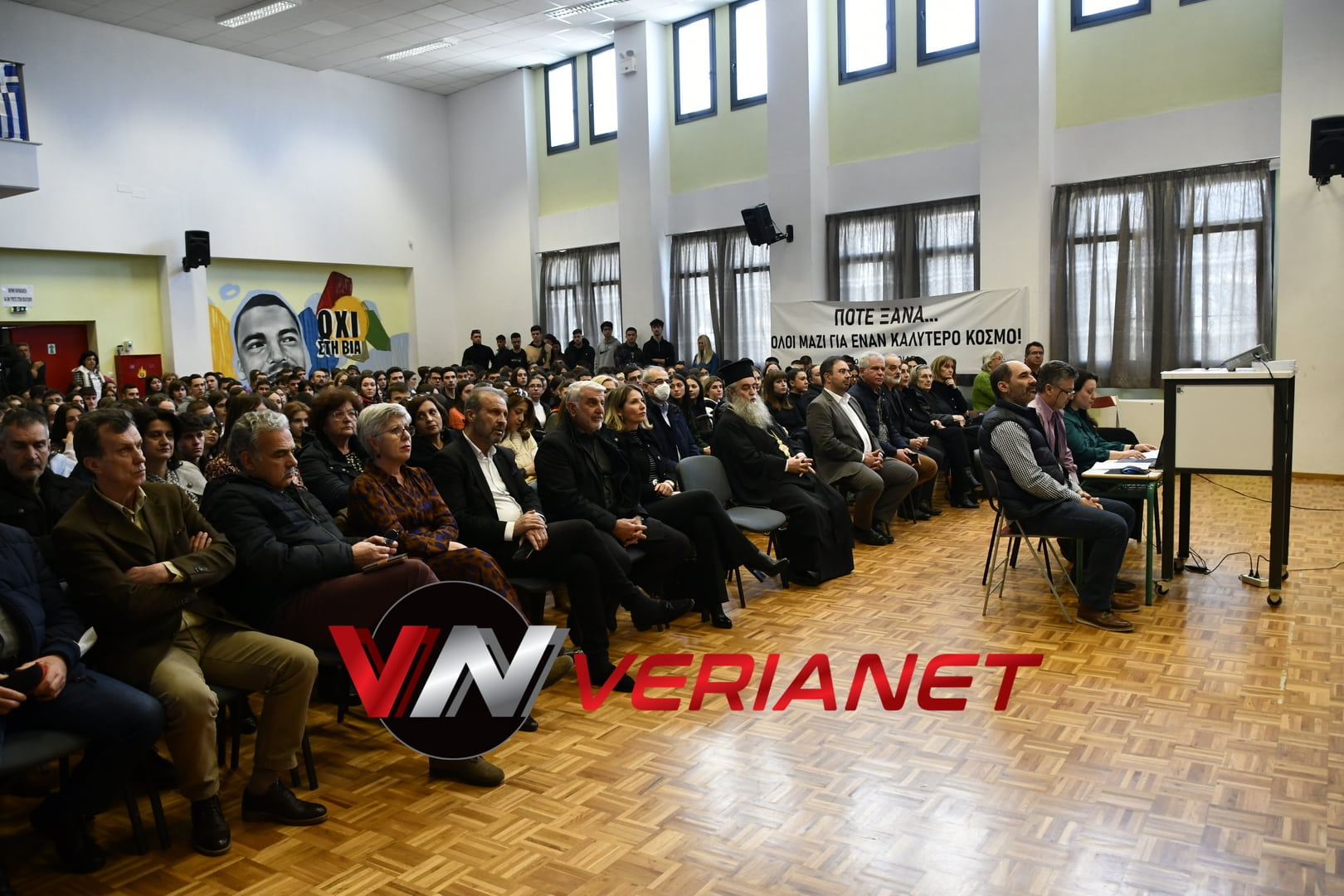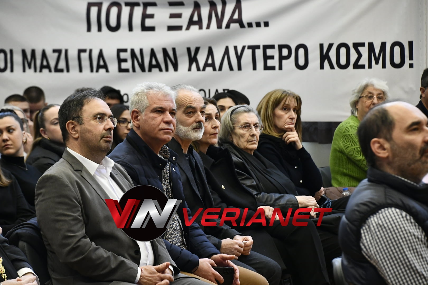 Σε μια αίθουσα συγκινητικά φορτισμένη, πραγματοποιήθηκε η εκδήλωση, με πανό κρεμασμένο με την αναγραφή «Ποτέ Ξανά.. Όλοι μαζί για έναν καλύτερο κόσμο» η οποία κοσμείται από μια τοιχογραφία graffitti από τον Βεροιώτη βραβευμένο καλλιτέχνη Θέμη Κωνσταντινόπουλο.