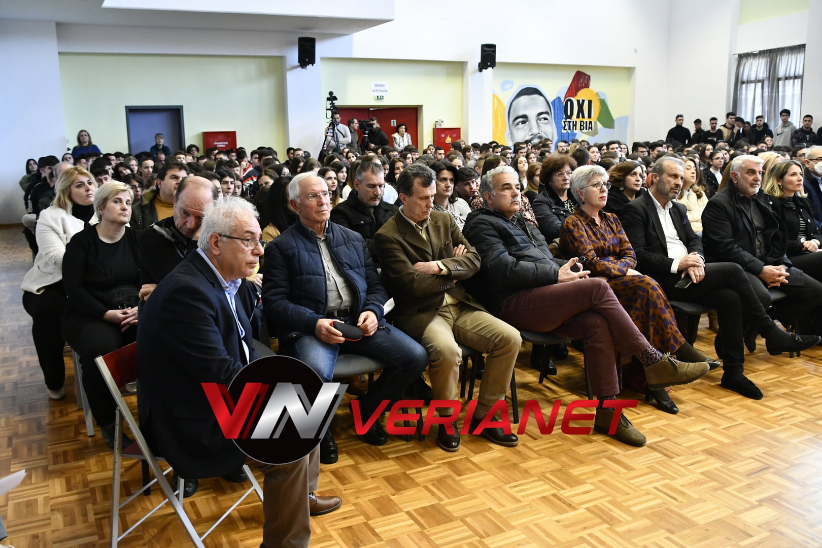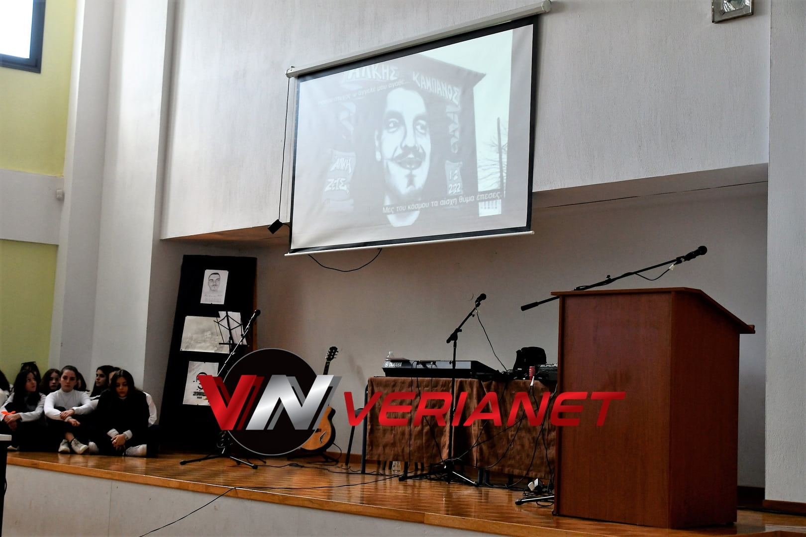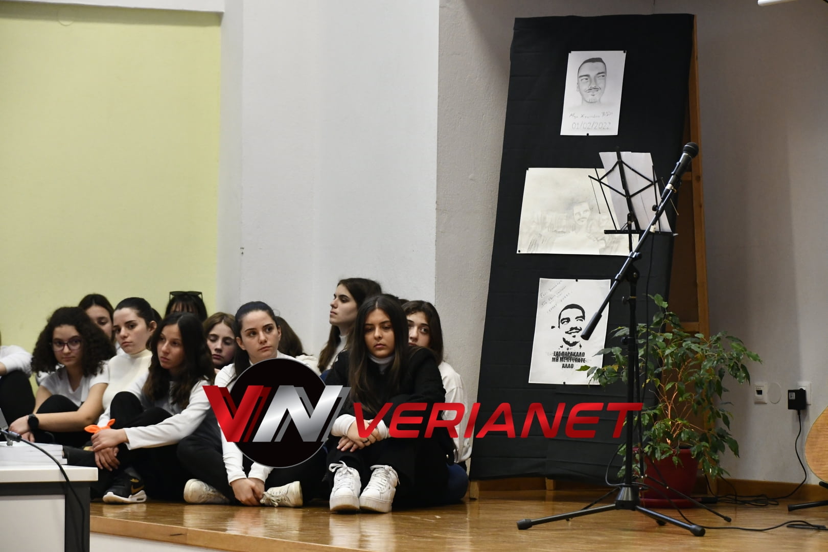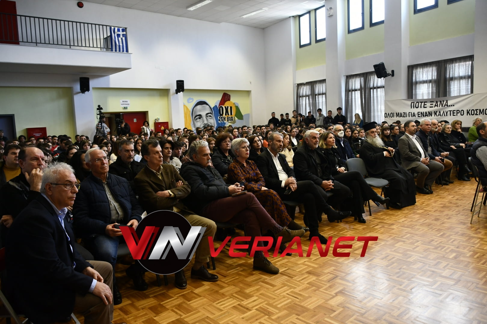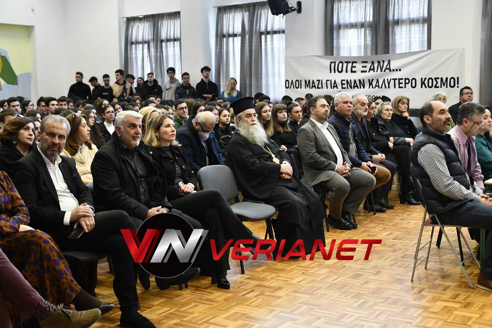 Σε μια αίθουσα συγκινητικά φορτισμένη, πραγματοποιήθηκε η εκδήλωση, με πανό κρεμασμένο με την αναγραφή «Ποτέ Ξανά.. Όλοι μαζί για έναν καλύτερο κόσμο» η οποία κοσμείται από μια τοιχογραφία graffitti από τον Βεροιώτη βραβευμένο καλλιτέχνη Θέμη Κωνσταντινόπουλο.