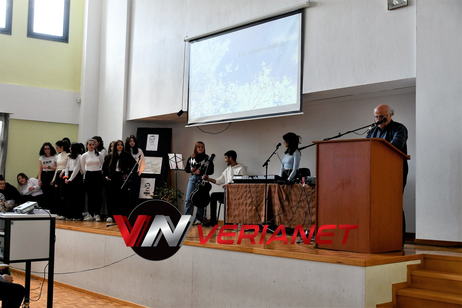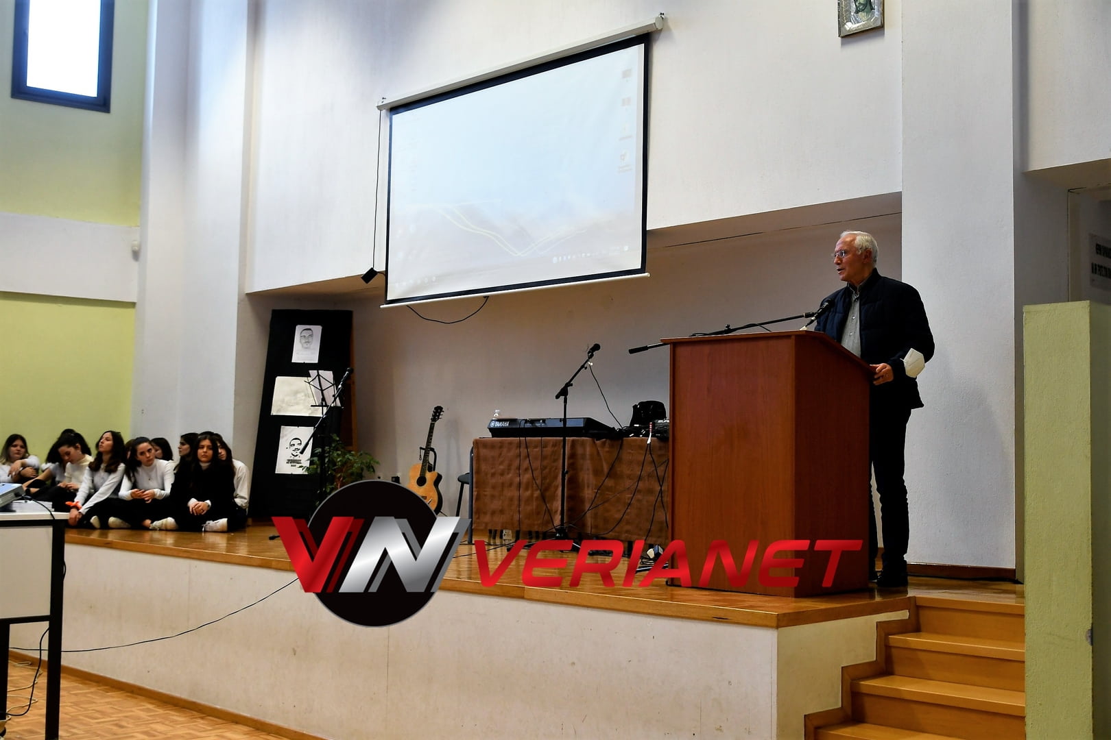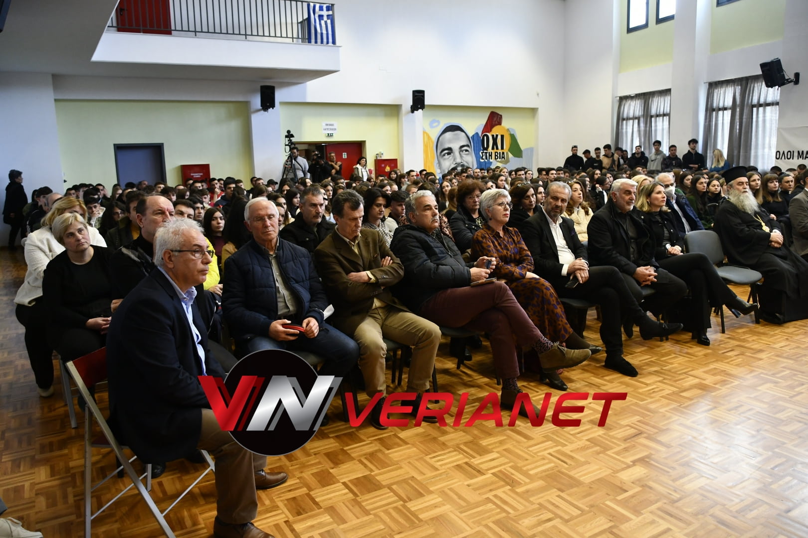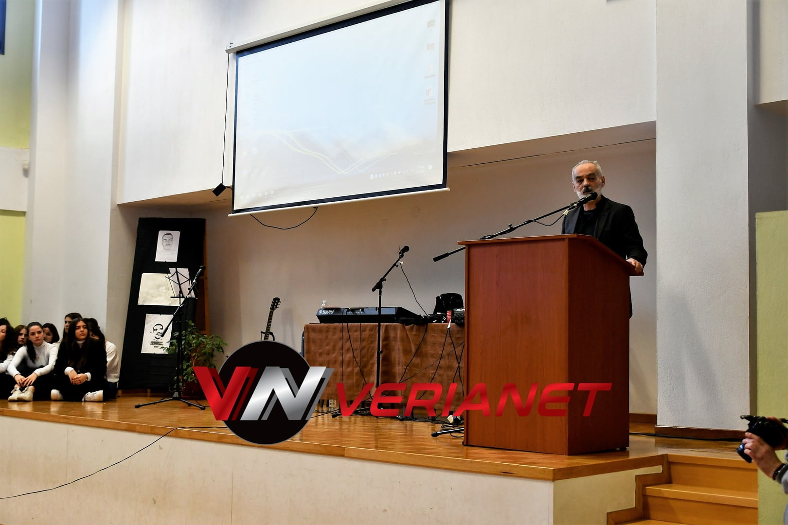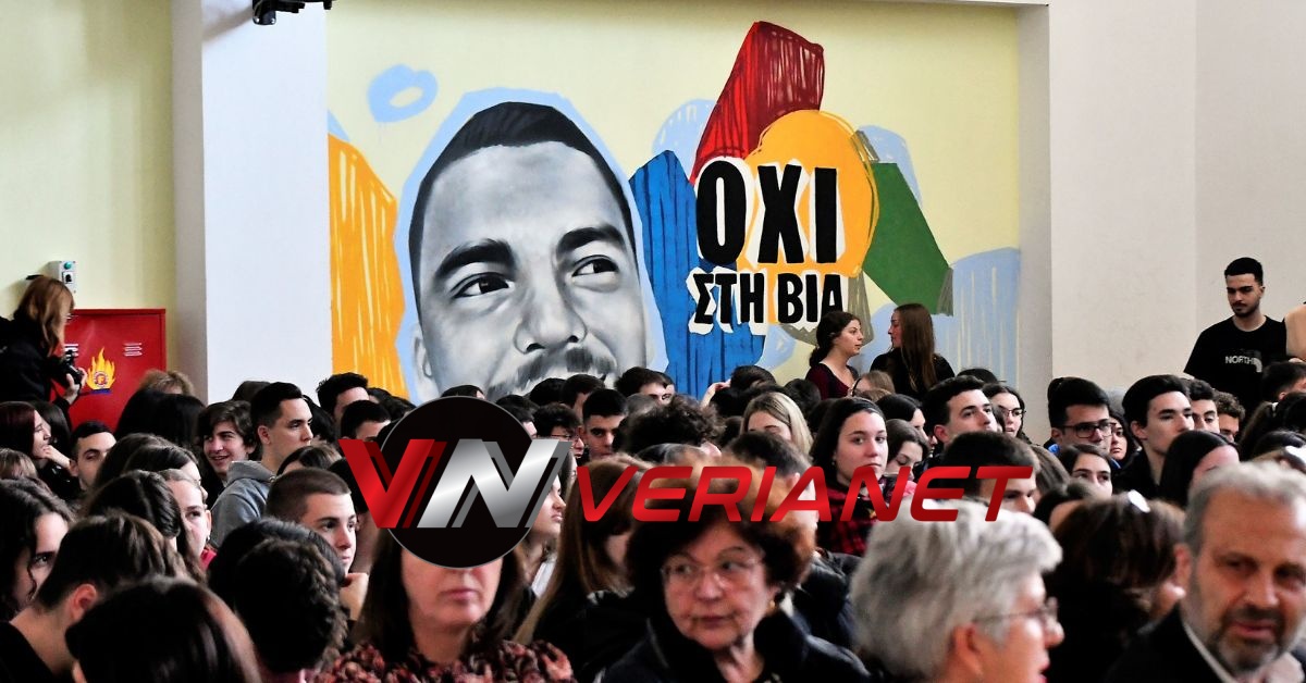 Σε μια αίθουσα συγκινητικά φορτισμένη, πραγματοποιήθηκε η εκδήλωση, με πανό κρεμασμένο με την αναγραφή «Ποτέ Ξανά.. Όλοι μαζί για έναν καλύτερο κόσμο» η οποία κοσμείται από μια τοιχογραφία graffitti από τον Βεροιώτη βραβευμένο καλλιτέχνη Θέμη Κωνσταντινόπουλο.