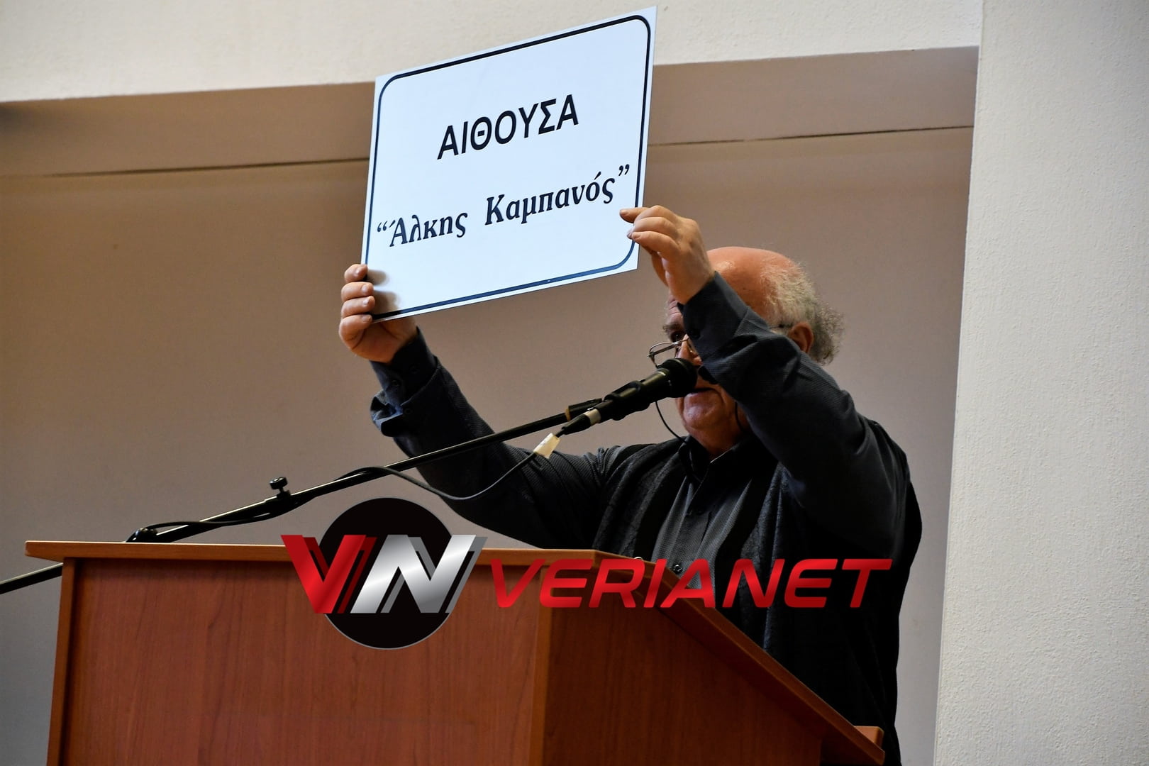«Κυρίες και Κύριοι, αγαπητά μας παιδιά. Είμαι ο Γιάννης Βένος, παλαίμαχος ποδοσφαιριστής του Άρη και είμαστε εδώ μαζί με τον Κούλη Αποστολίδη, παλαίμαχο ποδοσφαιριστή του ΠΑΟΚ για να χαιρετίσουμε την πρωτοβουλία του 2ου ΓΕΛ Βέροιας για την ονοματοδοσία της αίθουσας σε ΑΙΘΟΥΣΑ ΑΛΚΗ ΚΑΜΠΑΝΟΥ, που το όνομά του έγινε σύμβολο και σημείο αναφοράς κατά της οπαδικής βίας σε όλη την Ελλάδα αλλά και στην Ευρώπη.
