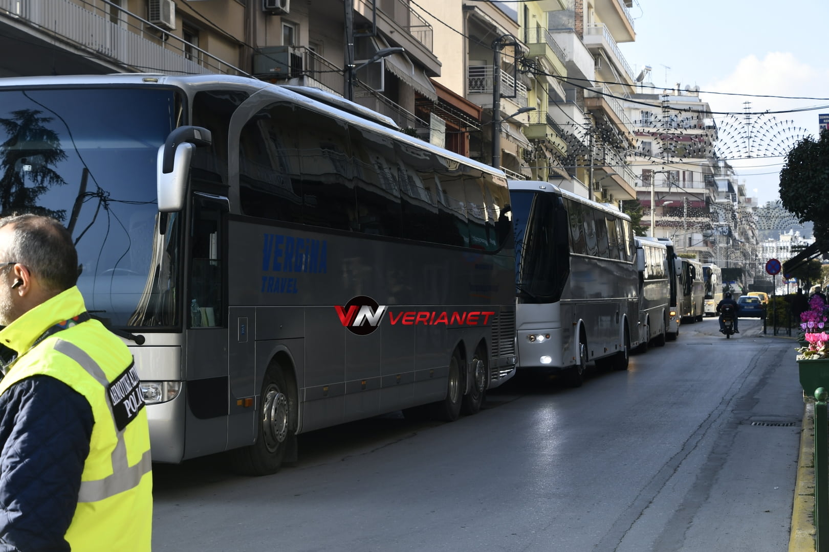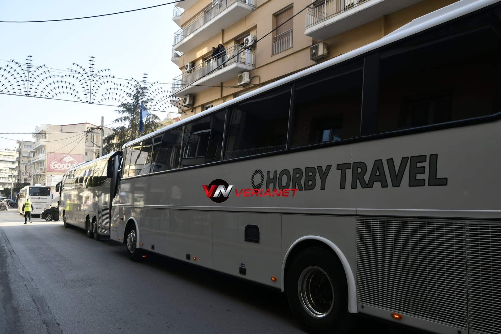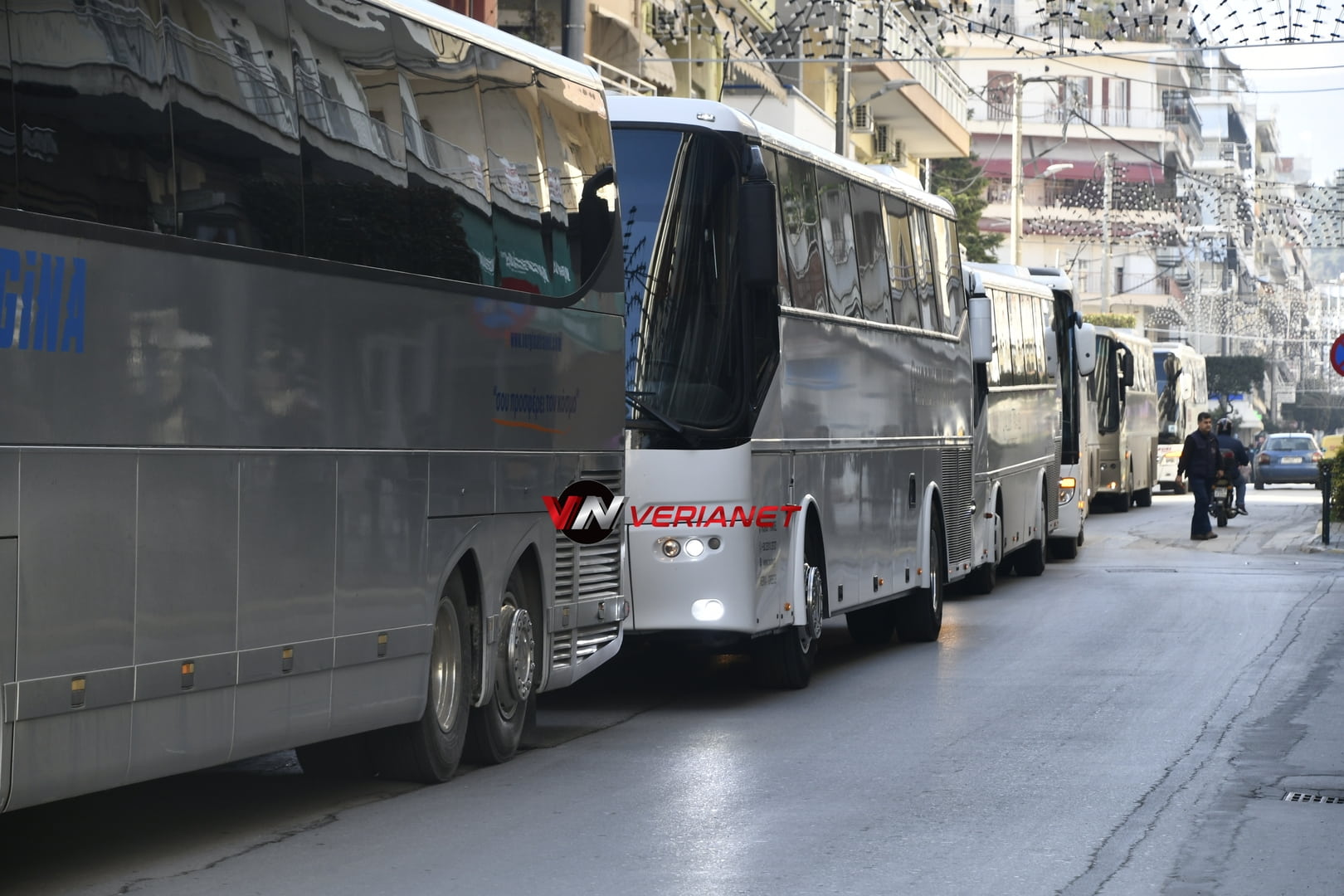 Το πρωί της Τετάρτης 21 Φεβρουαρίου, τα λεωφορεία συγκεντρώθηκαν επί της οδού Θεσσαλονίκης, στο ύψος του Σιδηροδρομικού Σταθμού, πέρασαν από Προμηθέα και Πλατεία Ωρολογίου και στη συνέχεια καθοδικά στη Μητροπόλεως σταμάτησαν μπροστά από το Δημαρχείο και τα γραφεία της Αντιπεριφέρειας.