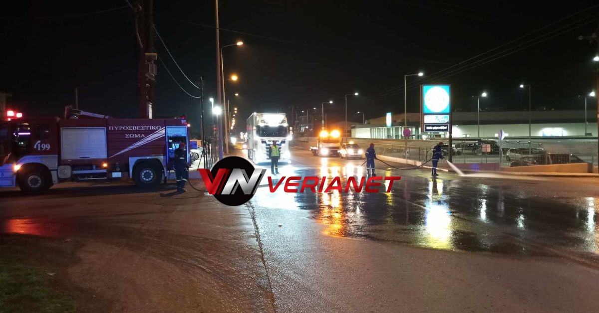 Στο σημείο η Τροχαία Βέροιας εφάρμοσε έκτακτα κυκλοφοριακά μέτρα ενώ όχημα της Πυροσβεστικής έκανε πλύση του οδοστρώματος από τα υπολείματα της σύγκρουσης.