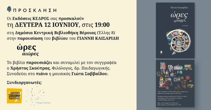 Οι Εκδόσεις ΚΕΔΡΟΣ σας προσκαλούν, τη ΔΕΥΤΕΡΑ 12 ΙΟΥΝΙΟΥ, στις 19:00, στη Δημόσια Κεντρική Βιβλιοθήκη Βέροιας (Έλλης 8) στην παρουσίαση του βιβλίου του ΓΙΑΝΝΗ ΚΑΙΣΑΡΙΔΗ «ώρες αιώρες».