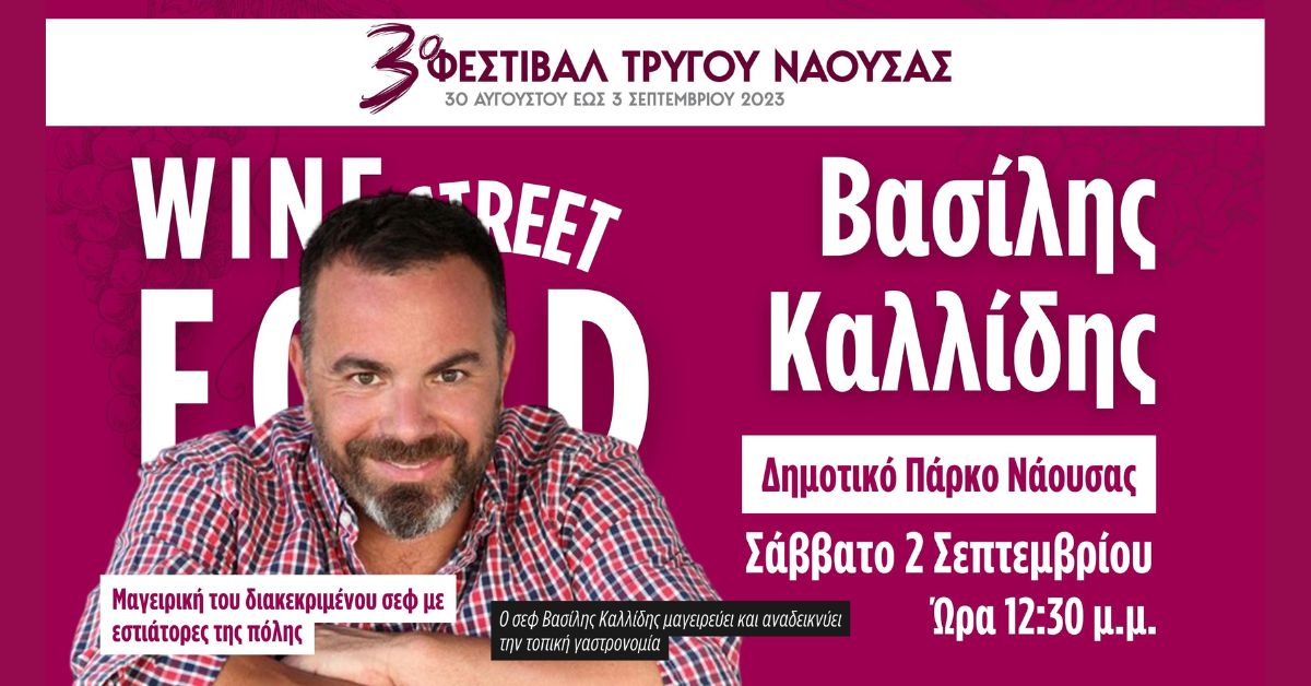 Το Σάββατο 2 Σεπτεμβρίου διοργανώνεται Wine Street Food και το 3ο Φεστιβάλ Τρύγου στην Νάουσα υποδέχεται τον διάσημο και πολυβραβευμένο σεφ Βασίλη Καλλίδη στο Δημοτικό Πάρκο Νάουσας στις 12:30 μ.μ.
