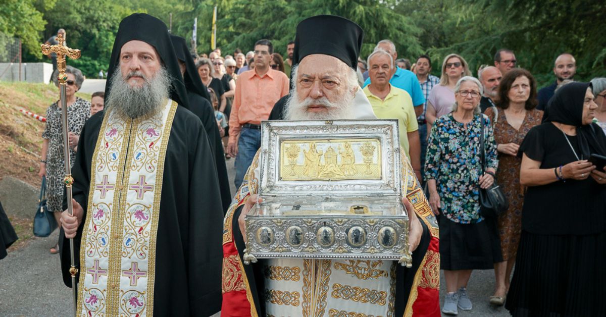Την ηγιασμένη χείρα της Αγίας Μαρίας της Μαγδαληνής μαζί με τεμάχιο του Τιμίου Ξύλου μετέφεραν από την Ιερά Μονή Σίμωνος Πέτρας του Αγίου Όρους, όπου φυλάσσονται, ο Ιερομόναχος Γερβάσιος και ο Μοναχός Διονύσιος, κατόπιν ευλογίας του Καθηγουμένου της Ιεράς Μονής Γέροντος Ελλισαίου.
