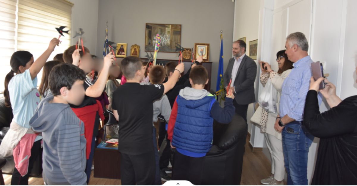 Οι μαθητές επισκέφθηκαν το Δημαρχείο Νάουσας μαζί με την δασκάλα τους κ. Όλγα Τσομεζίδου, ενώ το «Χελιδονίσματα» είναι ένα από τα πιο χαρακτηριστικά έθιμα του ερχομού της ανοίξεως, η συνήθεια δηλαδή να γυρίζουν το πρωί της ημέρας αυτής τα παιδιά της σχολικής ηλικίας τα σπίτια κρατώντας ένα ξύλινο ομοίωμα χελιδονιού και να τραγουδούν για τον ερχομό της ανοίξεως και την επιστροφή των χελιδονιών.