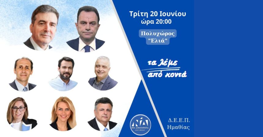 Την Τρίτη 20 Ιουνίου στον χώρο του πολυχώρου της “Ελιάς”, κλιμάκιο της Νέας Δημοκρατίας με συμμετέχοντες τους πρώην Υπουργούς Μιχάλη Χρυσοχοίδη, Γιώργο Γεωργαντά, μαζί με τους υποψήφιους βουλευτές Ημαθίας θα επισκεφθούν τη Βέροια για μια βραδιά ενημέρωσης και ανταλλαγής απόψεων, ενόψει των κρίσιμων εκλογών.